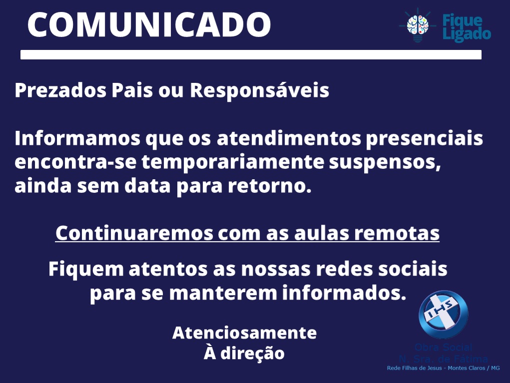 Informamos que os atendimentos presenciais encontra-se temporariamente suspensos, ainda sem data para retorno.