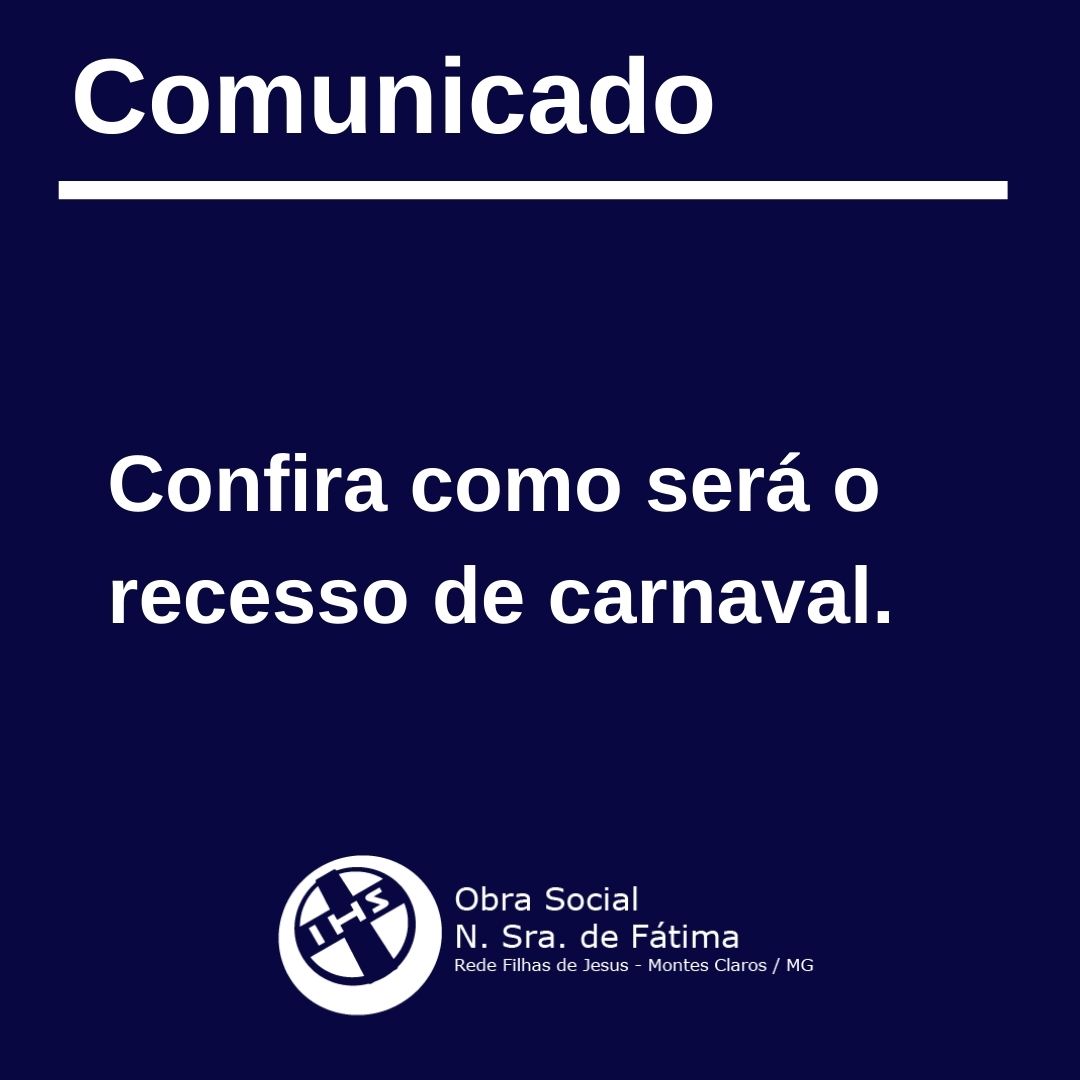 Informamos que estaremos em recesso nos dias 15, 16 e 17 de fevereiro, referente ao período de carnaval. Aproveitem para descansar e evitem viagens, festas e aglomerações.
