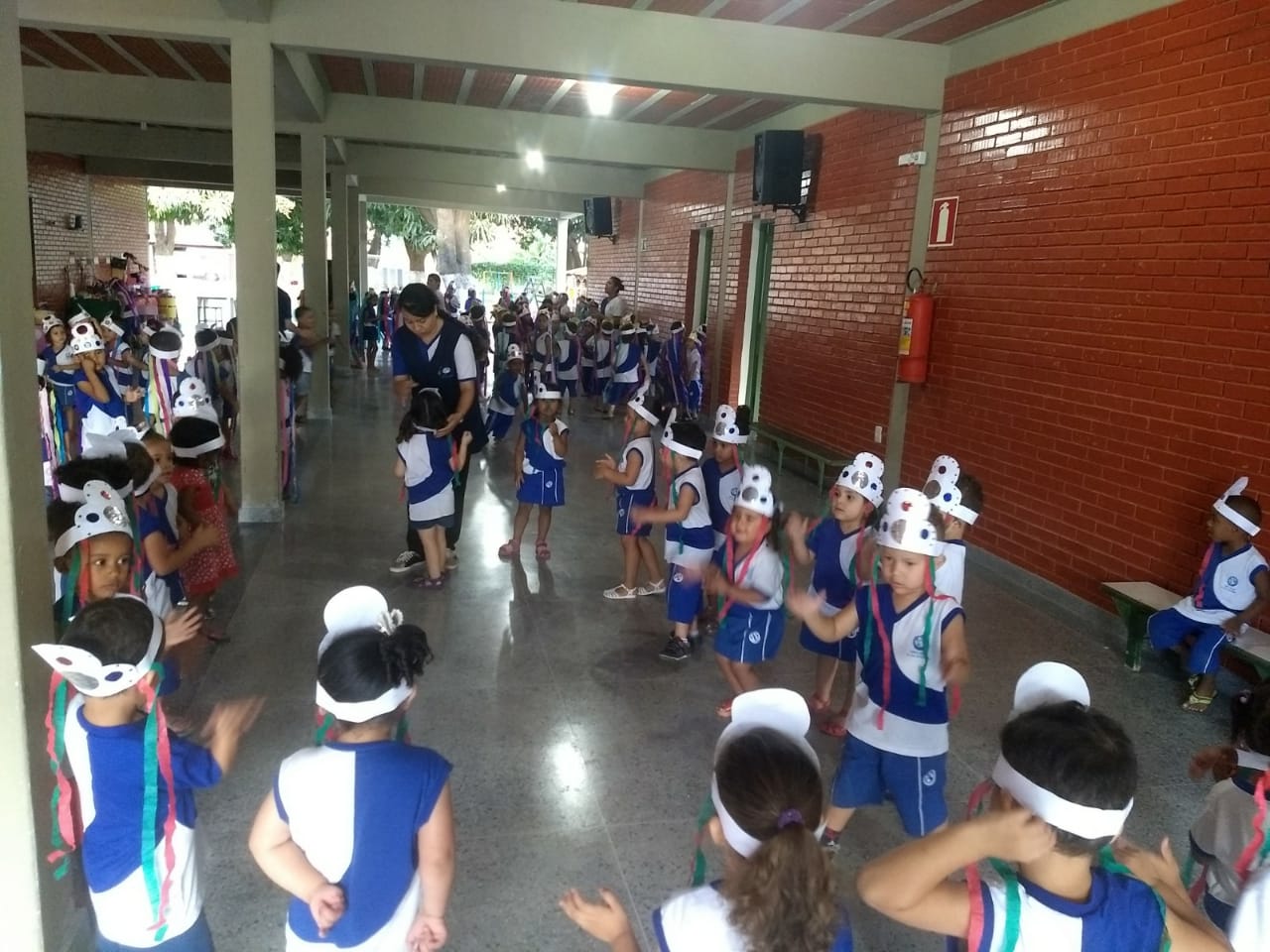 No dia 22 de agosto, as crianças reuniram-se no pátio usando o chapéu do catopê, brincando, dançando e saudando as tradições culturais do mês de agosto.